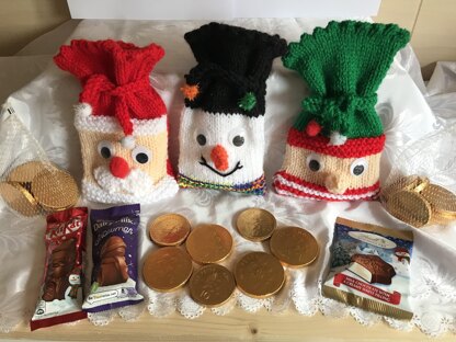 DK knitting pattern Santa, Snowman & Elf chocolate treat gift bag pouches