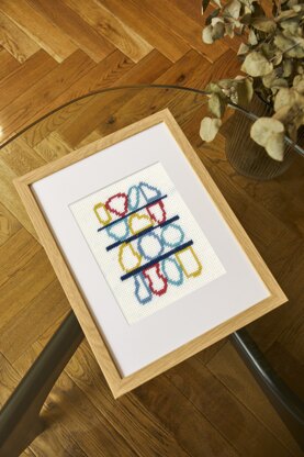 A contemporary abstract design using primary colours and geometric shapes.nStitched in DMC Soft Cotton for a modern matte effect, this kit contains everything you need to complete the project including pre-printed canvas, needle and clear instructions so you can relax into rhythmic stitching straight away.