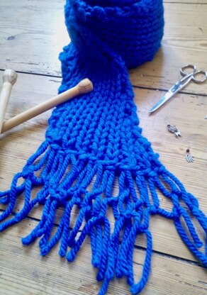 Take the journey to this pattern and knit a nice and fluffy scarf with bulky yarn. The playful pattern is a quick knit and the macramé fringe is just the eyecatcher you need to complete the perfect winter outfit.