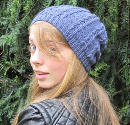 This hat is knit with a worsted weight yarn and has interesting linked cables finishing neatly at the top. It is a bit slouchier hence the revised name which keeps with the theme.