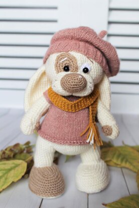 Crochet dog toy + outfit pattern in PDF format. It consists of 24 pages accompanied by more than 50 photos. The finished product using the materials stated in this pattern is ~9 inches / 22-23 cm tall.