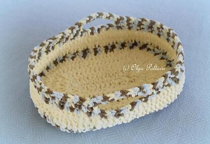 This is a crochet pattern for a doll basket made with chunky (category 6) acrylic yarn and a size K/10.5 (6.5 mm) hook. The finished measurements are about 18 inches long and 11 inches wide.