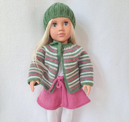 Round yoke style cardigan sweater pattern for most 18 inch dolls. Adorable matching skirt and beanie. Simple striping pattern worked bottom up for cardigan. Cardigan is worked back and forth to armhole, and in the round for the yoke. Skirt and beanie are worked in the round, bottom up. Familiar stitches are used, and set can be completed in a few evenings for your favorite little girl to play with!