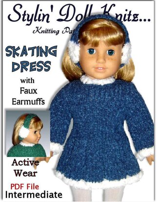 Pdf doll knitting pattern, fits 18 inch and American Girl dolls. Skating Dress with Faux Earmuffs.