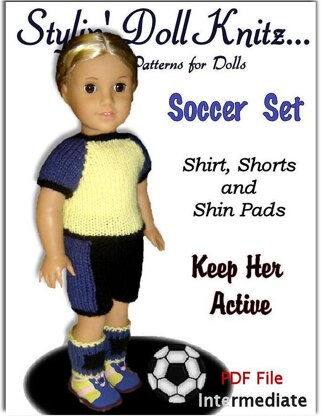 Pdf doll knitting pattern, free shipping through e-mail. Fits 18 inch and American Girl dolls. Soccer Set.
