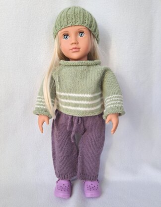 Adorable round yoke style pullover cropped style sweater pattern for most 18 inch dolls. Matching barrel style pants and beanie. Easy striping patterns on sleeve and sweater body. Familiar stitches are used, and set can be completed in a few evenings for your favorite little child to play with!