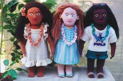 Three knit dolls with Hawaiian outfits and accessories. All dolls are the same pattern, so skin and hair color may be changed. Clothes may be removed and exchanged.