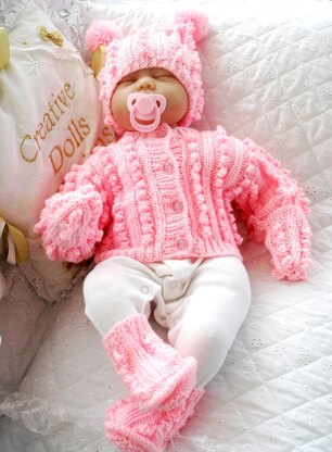 The pattern comprises of Bobble Cardigan, Hat, mittens and Boots