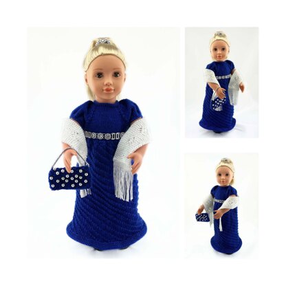 Dolls Clothes Knitting Pattern for 18 inch dolls such as Our Generation American Girl Maplelea Girl & similar dolls of the same proportions This is the 'Eleanor' outfit which includes evening gown, stoll/wrap and evening bag, all ready for a glammed up evening. Instructions are included to make her belt and hair decoration. The patterns are knit flat and seamed and are very easy to follow with clear instructions and photos. All yarn amounts and step by step instructions are included in the patterns.