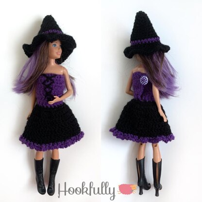 This crochet pattern is for a 12” dolls Halloween Witch costume. The dolls dress buttons up the back and is a fast and easy crochet project for kids. This pattern is easy skill level. The pattern is written in USA terminology. You will need to know basic crochet stitches. The dress and hat are both made in one piece and there is very minimal sewing involved. To expand you will need to sew on one button. The pattern is 5 pages long and includes gauge information, progress photos and finished sizes. ⭐️ SIZES ⭐️ The dolls Halloween costume is designed to fit 12” fashion dolls. ⭐️ Supplies you will need ⭐️ – Crochet hook 3.5mm (E-4) – Tapestry needle – DK/light worsted yarn (weight 3) – Scissors - 1 x 15mm button - Tape measure ⭐️ Yarn ⭐️ DK/light worsted (weight 3) yarn. I used King Cole Pricewise in the following colours and approximate amounts. A - Proper purple 6g (17m/19yd) B - Black 14g (40m/44yd) Total - 20g (57m/63yd)