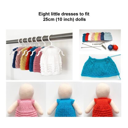 Knitted dolls dresses pattern to fit my 25cm (10 inch) basic doll. The pattern includes eight different cute little dress designs, a dress for every day of the week plus a spare! The patterns are knit flat and seamed and are very easy to follow with lots of clear instructions and 21 photos to help you with your designs.