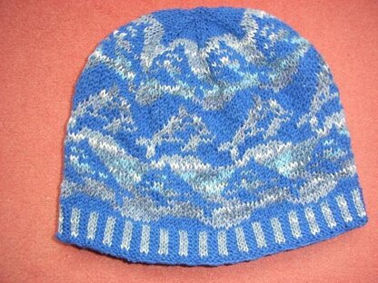 Hier springen Delfine um die ganze Mütze! Und es sieht so aus, als würden sie alle lächeln ;-) Die Form der Mütze ist salopp. Es ist zwar eine zweifarbige Mütze, aber aufgrund der größeren einfarbigen Abschnitte, etwas schwieriger zu stricken. Wenn man die Fäden aber in jeder Reihe an an einer and