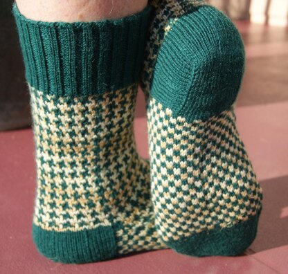 My Don’t Bite Me sock pattern highlights the yarn’s color and shine. The finished socks are very warm because of the double stranded work and soft on your feet. instructions are for size Medium and Large to fit foot circumference 22.5 (25) cm / 9 (10) inches; length toe to heal measures 21.5 (25.5) cm / 8.5 (10) inches. Material used:1 skein Cascade Heritage Sock Yarn number 5657, Hunter green, and 1 skein Cascade Heritage Hand Painted Sock Yarn number 9906, Wild Honey, or similar variegated yarn. Needles: 5 Double Pointed Needle size: 2 mm (US 0) Double stranded, doubled tail long-tail cast-on is used to give the edge greater elasticity. Using the Special wandering jog technique is used to make sure there is no jog visible. The chart’s stitches are marked so you can follow the pattern starting stitch as it moves to the left, around the foot, with the marker. The beginning stitch of the hounds tooth pattern will move around the foot like the stripe of a barber pole.