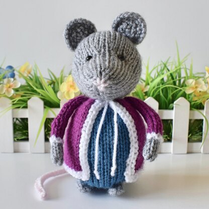 Dora Mouse is wearing a bright coat for a walk in the fields. This cute mouse would make a super toy or decoration for your home. Designed by Amanda Berry @fluffandfuzz, the mouse is knitted in acrylic DK yarns on single pointed needles (not in the round), and the tail is an i-cord tube knitted on two DPNs. Worked mostly in stockinette, with increases and decreases for shaping, this pattern also incorporates picking up stitches along an edge to make the mouse’s coat. Both the cream and grey mice in the photos are knitted from the same pattern, simply worked in different coloured yarns. For confident beginners and above, other techniques used include casting on and off, knits, purls, and seaming to finish.