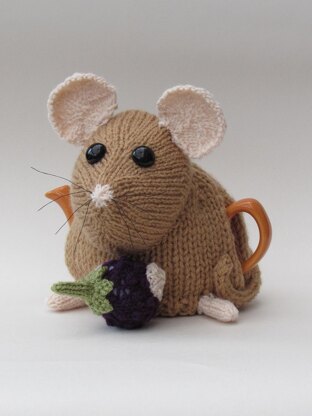 The pint sized Dormouse tea cosy is delightfully cute and he's holding a blackberry, which I suppose he's going to eat with his tea. He had big black eyes and large peachy coloured ears.