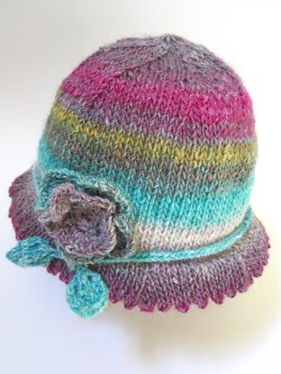 This charming hat is both fun to make and fun to wear. It begins with a provisional cast-on and is worked circularly from the brim to the top of the hat. The crocheted flower and the leaf-ended I-cord embellishments are worked separately and then sewn to the hat.