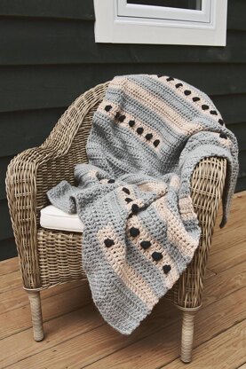 This geometric crochet lapghan can serve as a small blanket for the couch or the car, and it can also function as a decorative rug. High contrast streams of bobbles accent a simple base of double crochet to bring a modern aesthetic to this easy project.