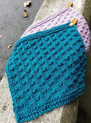 Yarn required: Any worsted weight cotton yarn that you can get gauge with. I used Knitpicks Dishie yarn (190 yds per 100 g ball) in Lilac Mist and Kenai.