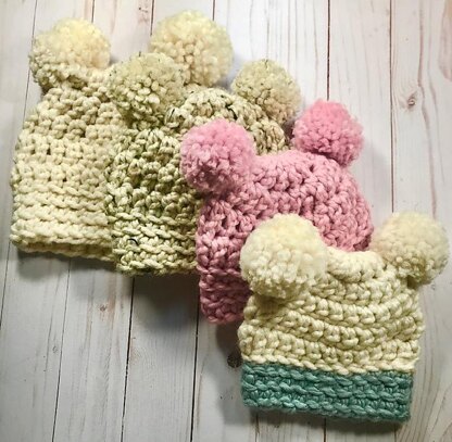 Introducing the Double Pom Pom Baby Beanie, a super bulky slouchy beanie. I hope you enjoy making it as much as I do. I have it in three sizes for you from newborn, 3-6 months and 6-12 months old.
