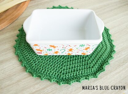 Using cotton yarn, this crochet potholder/hot pad is double sided and comes out to 9" in width.
