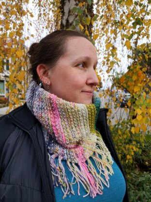 This cowl is provisionally cast on and worked flat, horizontally in stripes, until all stripes have been worked. After joining the last row to the provisionally cast-on row, the cowl is folded in half and the 2 layers of fabric are secured to each other via either fringe or a round of single crochet.