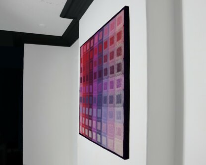 It uses nine different colours. The wall-hanging in the photo was made using DK yarn. Any type of yarn can be used, in any colours. Changing the yarn may result in a larger, or smaller piece. Mathematically nine colours should give 45 different permutations so should show 45 shades. Because of the illusion technique this pattern actually shows 81 different shades.