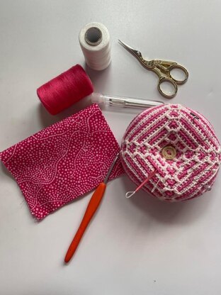 This pin cushion is made up of two squares worked in the round using the overlay mosaic crochet technique. These are then joined in a unique way to create a circle. The method of joining is similar to that of Biscornu pin cushions which are normally sewn or embroidered with material - so I have used crochet instead!