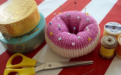 A fun doughnut shaped pin cushion in dk wool. It is a really simple shape, a rectangle made into a tube and gathered. Beads are sewn on to the top. This would be a good project for beginners. Measures 10 cm wide x 5 cm deep.