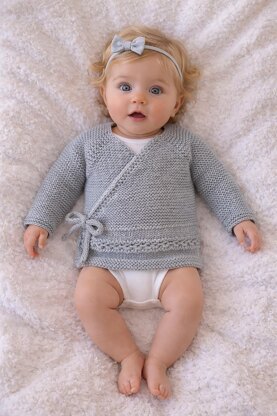 This kimono-style, crossbody baby cardigan is knitted primarily in garter stitch and features a delicate textured pattern across the body. Worked seamlessly and knitted flat (back and forth), it is an ideal choice for newborns, offering both comfort and ease of dressing. The sleeves are knitted in the round, and the cardigan is fastened with two elegant I-cord ties.