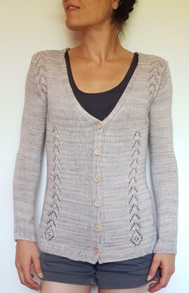 This cardigan is knitted from top down seamlessly. You will begin with knit the back to the armholes, including a lace panel and stockinette stitch. Then you put the back stitches on hold to knit each front separately to the armholes, finally you will join to knit the back, front together until end. The sleeves will be knitted in the round, picking stitches around the armhole.