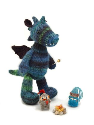 This is a very cute project with interesting stitches and techniques. It is advanced-beginner level, but don’t feel intimidated if you like to learn new things. The dragon looks good in a wide range of yarns, so feel free to use what you like or have. The knight and princess take very little yarn, so are good to use up left-overs. They can be as simple or as creative as you like.