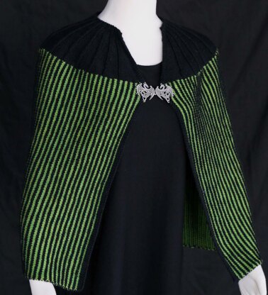 Within this striking medieval cape lurks a hidden dragon, visible only at an angle.  The cape is worked sideways, from right to left, then turned and the stitches are picked up along the top to work the neckline from the cape upwards.  There are no armholes and the front is secured with a frog.  Illusion knitting or shadow knitting is surprisingly easy to do.  Pattern is charted with special instructions and includes schematic.