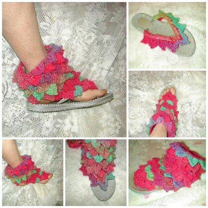 Instructions include directions for a trim to cover your flip flop straps. And a bootee cuff that you can either wear as a barefoot sandal, or attach to your flip flops. The multicolor yarn is Red Heart Unforgettable in the color Parrot. Written in American crochet terms, pictures of many of the steps.