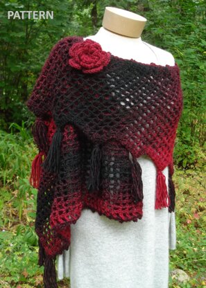 Crocheted in an openwork mesh pattern that starts at the point and increases every row until the desired length is achieved. Add a picot edging along the gently curving top edge and plush tassels along the bottom. Instructions are included for a rose fastener if so desired.