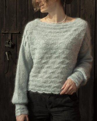 Dreamcloud Sweater is a feminine and modern pullover with a boxy fit, and overall body texture, that resembles little, soft clouds. It features a beautiful, wavy collar and bottom edges, as well as extravagant cuffs and ballon sleeves. The sweater is reversible, and the difference in texture is very significant, giving you two pullovers in one. A modified drop-shoulder construction gives it volume without being bulky.