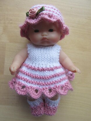 Instructions to make dress with crochet style edging, matching hat, panties and shoes. Uses straight needles and 4 ply yarn.