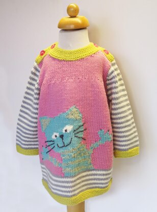 Pretty Dress with (optional) Cat Motif - worked using intarsia method. To fit birth to 3 years.