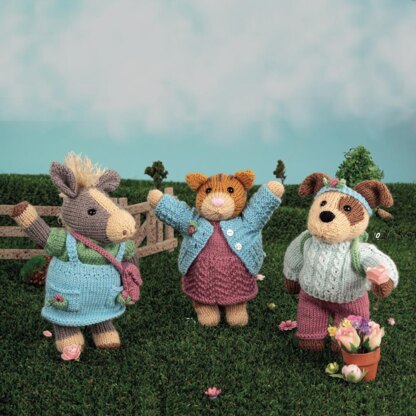 Woodruff the Puppy, Rolo the Kitten and Gracie the Pony are a stylish trio, dressed for adventures. Their wardrobe of clothes and accessories are designed to fit all three toys so they can swap outfits. The puppy is dressed in a mock cable sweater, trousers, backpack and headband, the pony in a t-shirt, cargo skirt, briefs and messenger bag, and the kitten in a dress, cardigan and briefs. Designed by Amanda Berry @fluffandfuzz, the toys are knitted in wool blend DK yarns on single pointed needles (not in the round). For intermediate knitters and above, other techniques used include casting on and off, knits, purls, increases and decreases, knitting stripes, intarsia colour-work, duplicate stitch (Swiss darning), embroidering noses and seaming to finish. Puppy is 22cm tall, Kitten is 22cm tall and Pony is 24cm tall (these measurements are from the toys’ toes to the tops of the ears).