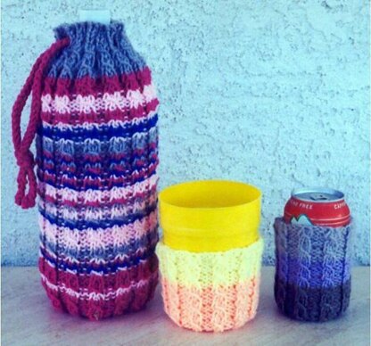 Now this is something everyone can use! Even a fast knit cover to put over a 2 liter bottle! We used up scraps of yarns to make this colorful as can be. This easy stitch pattern looks like a cable but isnt. It is much easier! There are also sizes for soda cans, and 20 ounce drink cups. Such fun to knit, and beginners who feel confident can knit these too for friends! Great idea for keeping your drinks cold and using up colors of yarns! Uses worsted weight yarns, knitting needles, US # 8.