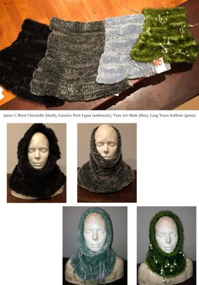 Droplet Geode Fur Cowl A soft, warm, fun, stress-free cowl that works up in many different faux furs to many different sizes, depending on the fur yarn you choose. The droplet ripples are achieved with short-row color inserts. They start and finish at the same place so that the yarn ends can either be woven-in, or tied off and pulled to the front to act as tassels, or beaded fringe. Measurements are given for each yarn tested to aid you in your choice of yarn. Aim for about 4-6 stitches for 2 inches in stockinet. This is a great stress-free knit because, though it’s sometimes hard to see what you are doing in faux fur, it also hides everything. You really can’t make a mistake of any import. The finished size depends on the yarn you use.