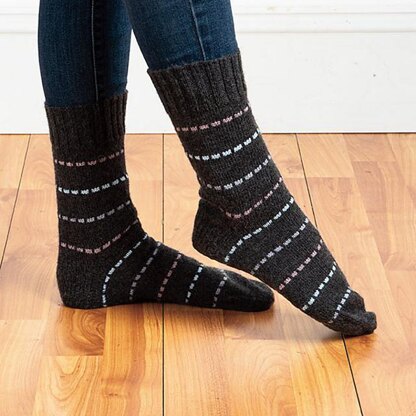 Worked from the top down, the heel flap is worked in rows with a short-row heel turn. Stitches are picked up on each side of the heel flap and the foot is worked in the round with the same number of stitches as the leg. No gusset is worked with this style heel keeping the same stitch count on both the leg and foot. Gender-neutral patterning and a full range of nine sizes will let you knit these for everyone you know.