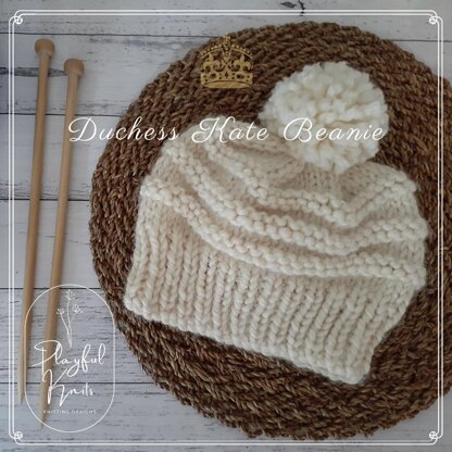 The beanie uses one ball of Lion Brand, Wool-Ease Thick and Quick, 170gm, 97m which has a yarn gauge of 9stx12 rows over 10cm using 9mm needles. A bright white yarn is preferable if you are wanting a similar look to Kate' beanie. Remaining yarn can be used for a 8.5cm pom pom.