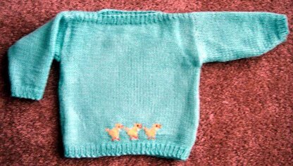 A super easy knit baby pullover! With a super easy duck pattern to knit in, or embroider on! The pattern goes quickly as the front and backs are worked the same. Sleeves are worked separately and sewn in. There isnt much work to this, and a new mom will love this for her new baby! This is a nice design for girl and boy babies! Uses sport weight yarns, knitting needles US # 6. Finished size fits from 6 to 12 months.