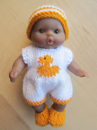 Instructions are for the romper suit, striped hat and shoes. Experienced knitters will make this in an evening but ambitious beginners could have a go as well.