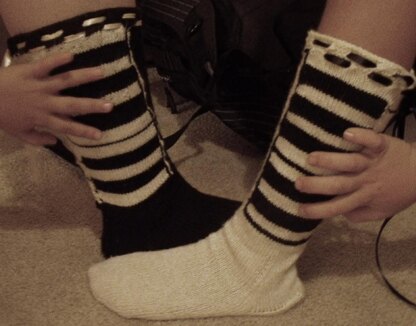 Inspired by the beauty of the piano, these socks have a full keyboard shown the outside of the leg. The construction is unique in that it is worked toe up, but once you get to the ankle it is either worked in the round or worked flat with eyelets put in for lacing up the back. One represents a black piano while the other is a white piano. Of course if you want your socks to match (ie. Both black pianos) it is easily done. It is easily adjustable to your size since it can be tried on as you go and stitches can be added or subtracted for the best fit.