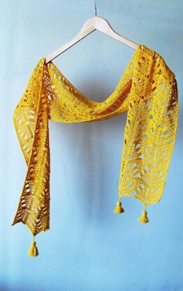 Filigreed scarf with tassels and oriental tinge. Long enough to wrap in fickle weather, and fine lacy texture makes it the prefect accessory for any season. Scarf has gorgeous flowing drape, it could also be expanded one repeat for a wider stole. The pattern has a nice rhythm to it, not difficult, but not boring. Pattern has written step-by-step instructions and chart, skill level is intermediate.