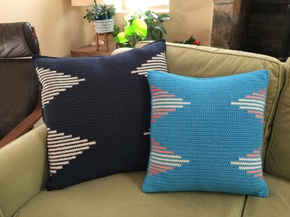 Give your home some modern, minimalist style with this set inspired by the free-spirited mountain town of Durango, Colorado. Single crochet stitches through the front loop create a woven-like textile. Because the yarn can be cut at each color change and knotted at the back of the work and sewn inside the finished pillow, there’s no need to carry colors or weave in ends!