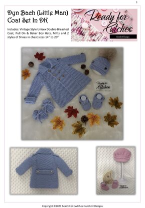 The pattern consists of a vintage style coat with epaulettes and tabs (optional) on the shoulders, sleeves and back, a baker boy and pull on hat, T bar and Mary Jane shoes and little mitts. All items are in 4 sizes with the coat being in chest sizes 14", 16", 18" and 20" so is suitable from birth, in fact this set is for my grandson to wear home