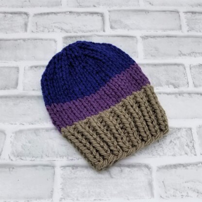 The Dysartsville Teen Hat Knitting Pattern is created with a unique three-color combination and 1 x 1 ribbing. It is a great way to use up scrap yarn and sparks your creative side thinking up unlimited color choices. It is a hat you will want to knit again and again.