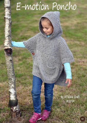 E-motion Poncho is cozy oversized garment which is knitted back and forth in combination of Stockinette and Grid stitches. The poncho is designed with positive ease about 25 cm/ 10 inches, dropped shoulder and comfy hood. The back of poncho is longer than front for extra warms and comfort. Also the poncho is decorated with little pocket at front. Back and front of poncho are knitted separately. After the shoulder seams are completed the stitches are picked up for hood and edge band. The edge band is knitted in the round in ribbing.